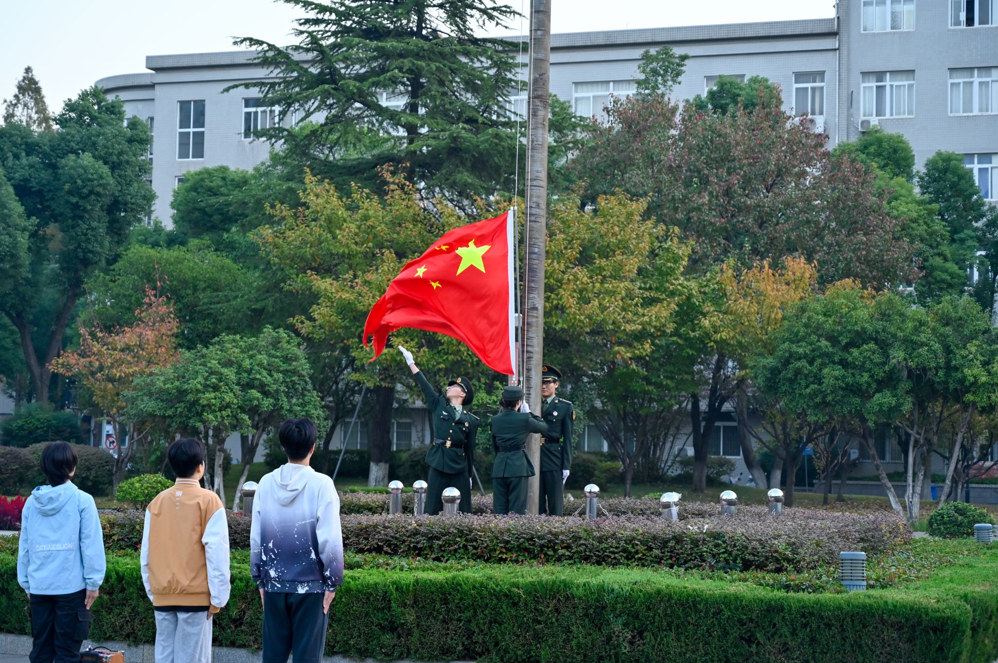 升国旗仪式在广场上隆重举行。国旗护卫队身着整齐的制服,手持国旗,迈着坚定的步伐走向旗杆。随着雄壮的国歌声响起,五星红旗迎风招展,缓缓升至旗杆顶端。全体师生肃立,目光紧随国旗,齐唱国歌,表达对祖国的崇高敬意。